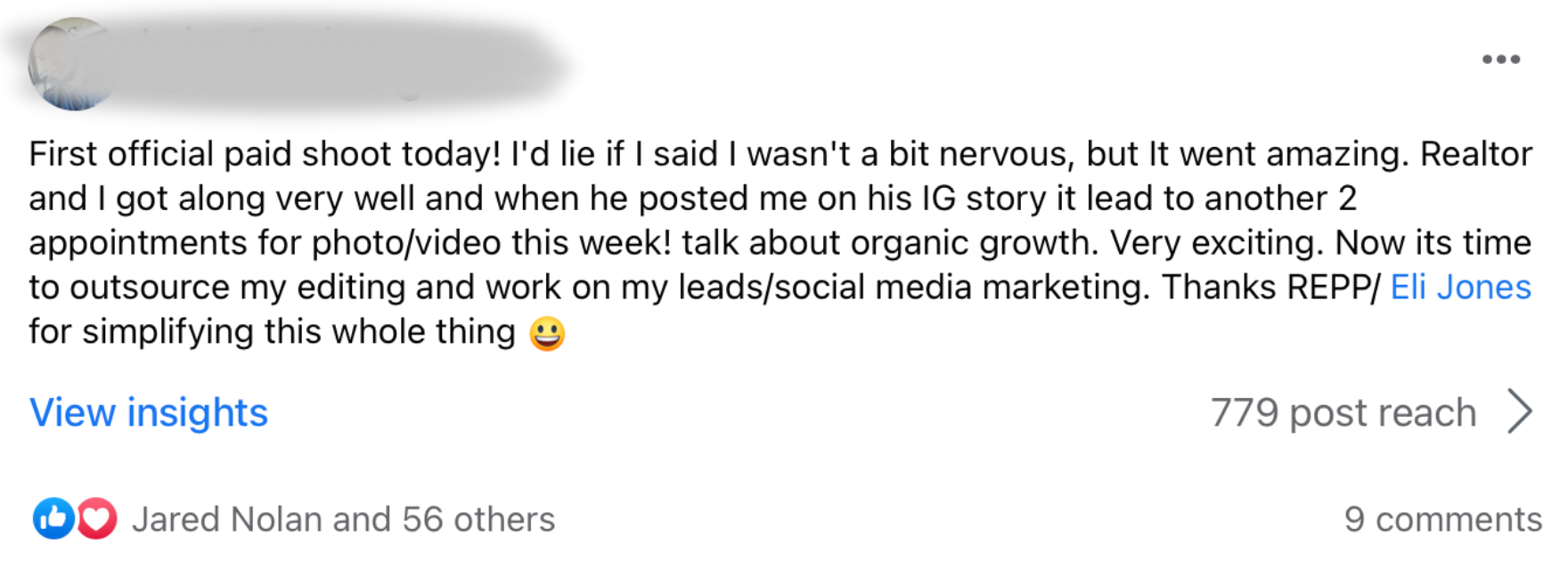 "Eli and his REPP course has been invaluable to me and my new business startup this past year. He has created a beautiful community of RE photographers that daily encourage, inquire and challenge each other. He and his team lead weekly Q&A sessions that are incredibly helpful and they are always available to answer questions and respond in a very timely manner. I was honestly on the fence for a while, but when I finally pulled the trigger back in the fall, this course opened up my world. I am very grateful for this team and the community they have pulled together!"